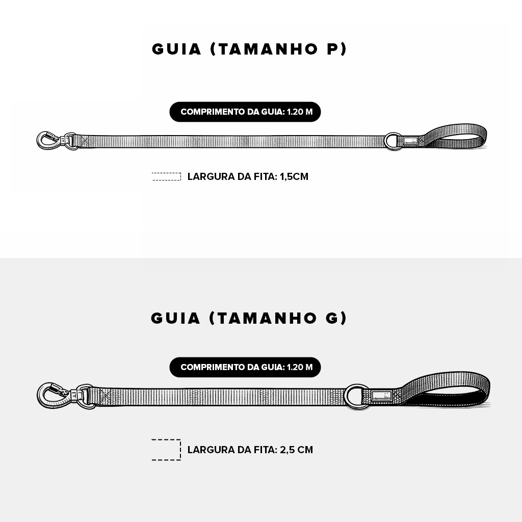 A Guia tem 1,20 m de comprimento, conta com alça em Neoprene e sistema exclusivo Cachorreiros® encurta guia.