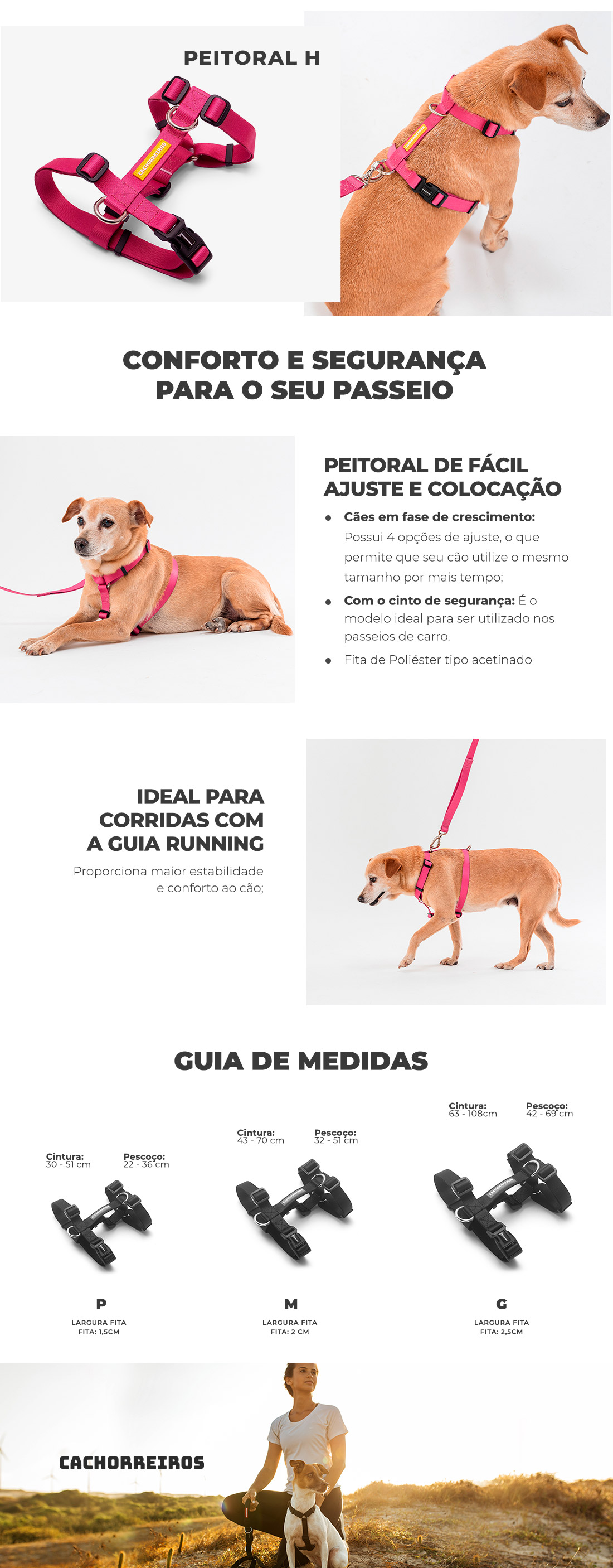 Peitoral de fácil ajuste e colocação. Conta com dois engates, um próximo ao pescoço, que permite maior controle sobre o cão e outro posicionado na parte posterior, para conduzir com maior conforto.