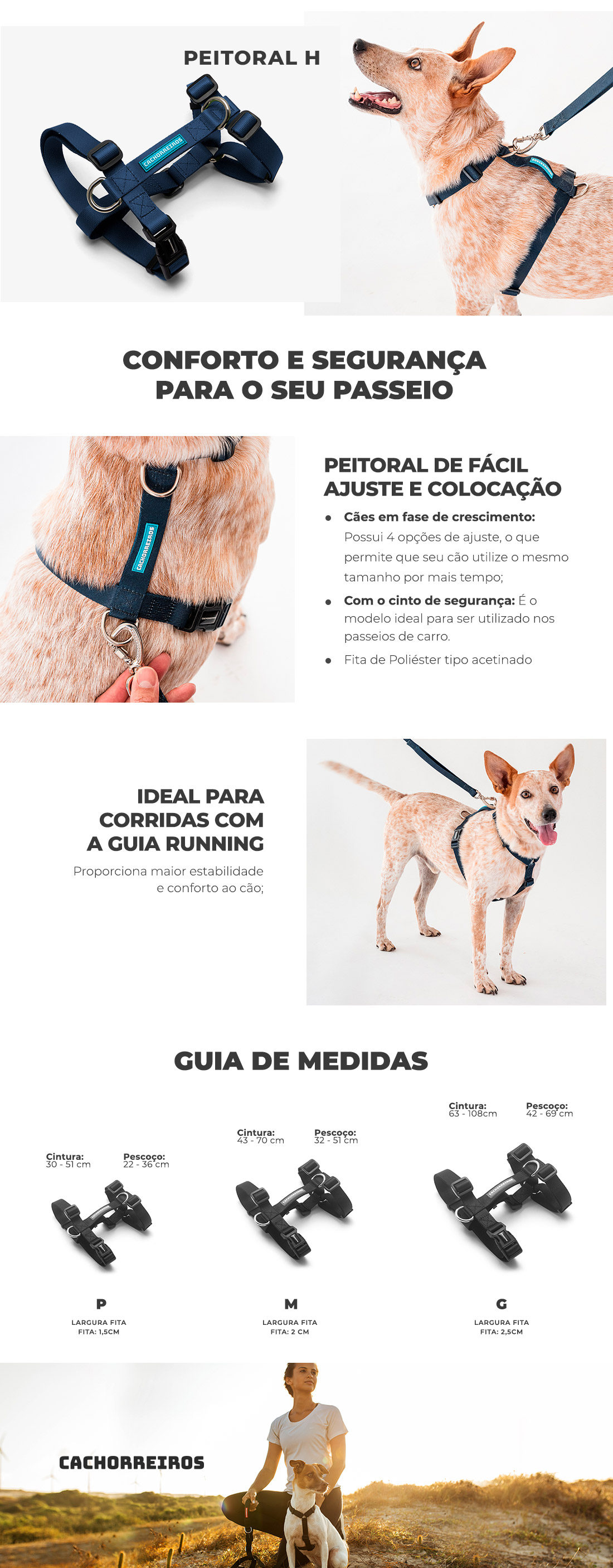 Peitoral de fácil ajuste e colocação. Conta com dois engates, um próximo ao pescoço, que permite maior controle sobre o cão e outro posicionado na parte posterior, para conduzir com maior conforto.